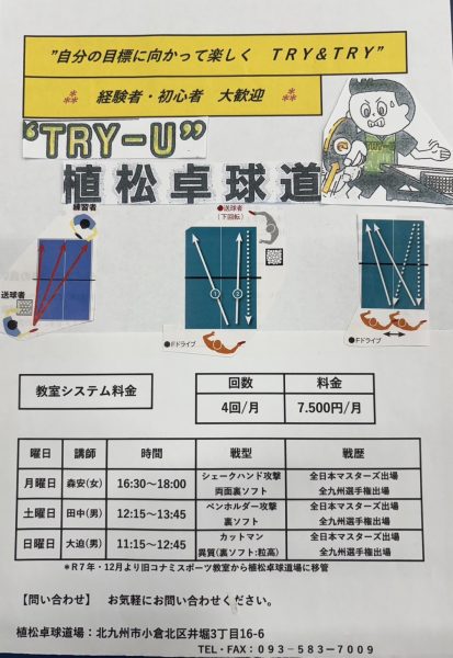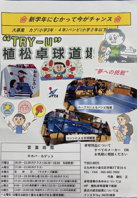 TRY-Uでは、幼児、小学生から卓球を始める生徒を募集しています。